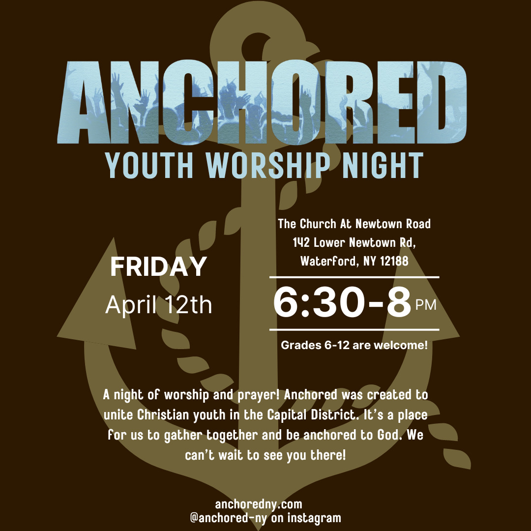 Anchored is a night of renewal and encouragement in the capital district through worship and prayer! Anchored was created to unite Christian youth in the Capital District. It's a place for us to gather and be renewed and anchored to God.